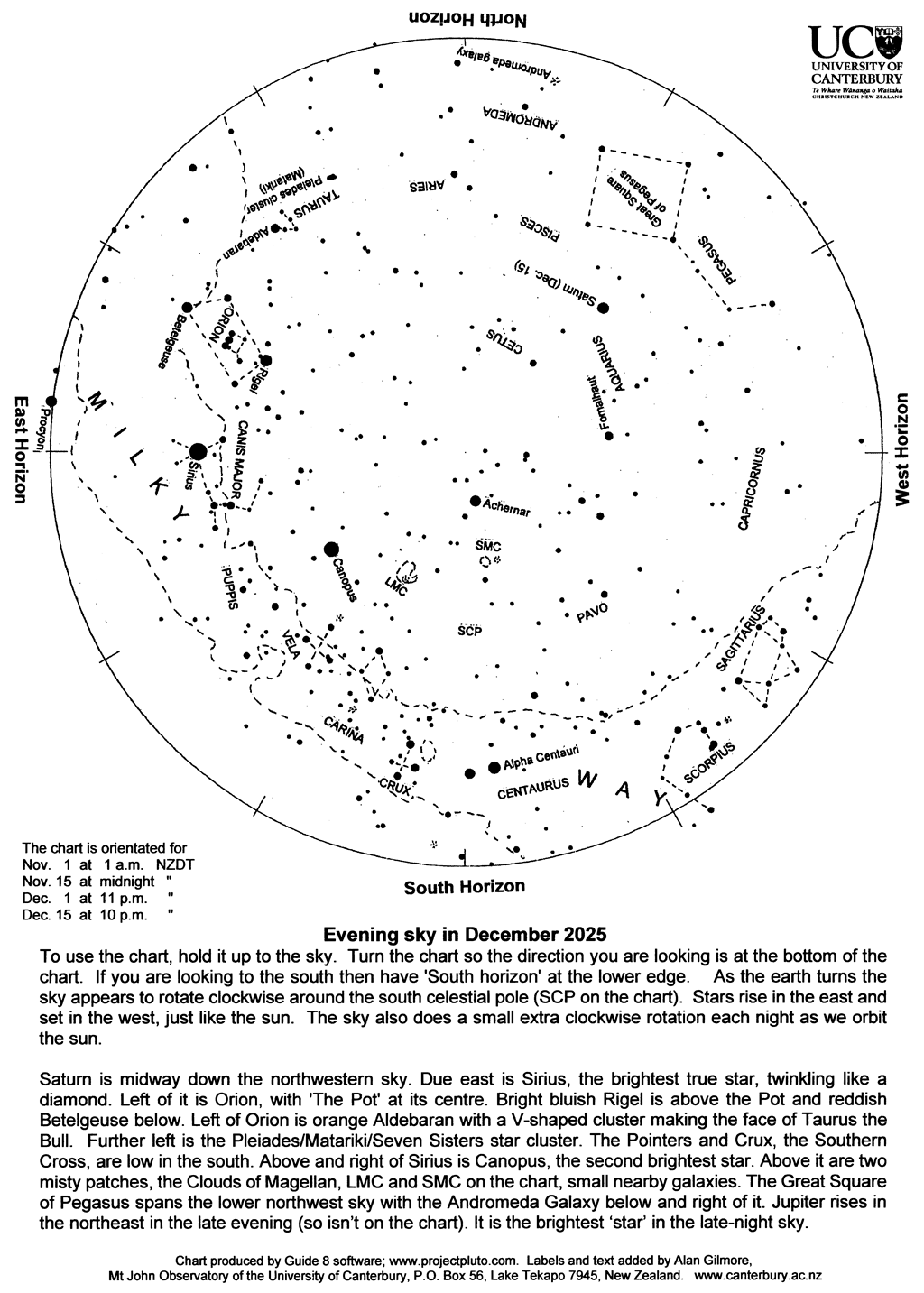 Low in the south are the Pointers, Beta and Alpha Centauri, and Crux the Southern Cross, upside down at this time of the year. The Milky Way is wrapped around the horizon. The broadest part is in Sagittarius, low in the southwest at dusk. It narrows toward Crux in the south and becomes faint in the east below Orion. Several star clusters and a glowing gas cloud can be seen in the Milky Way above and left of Crux.