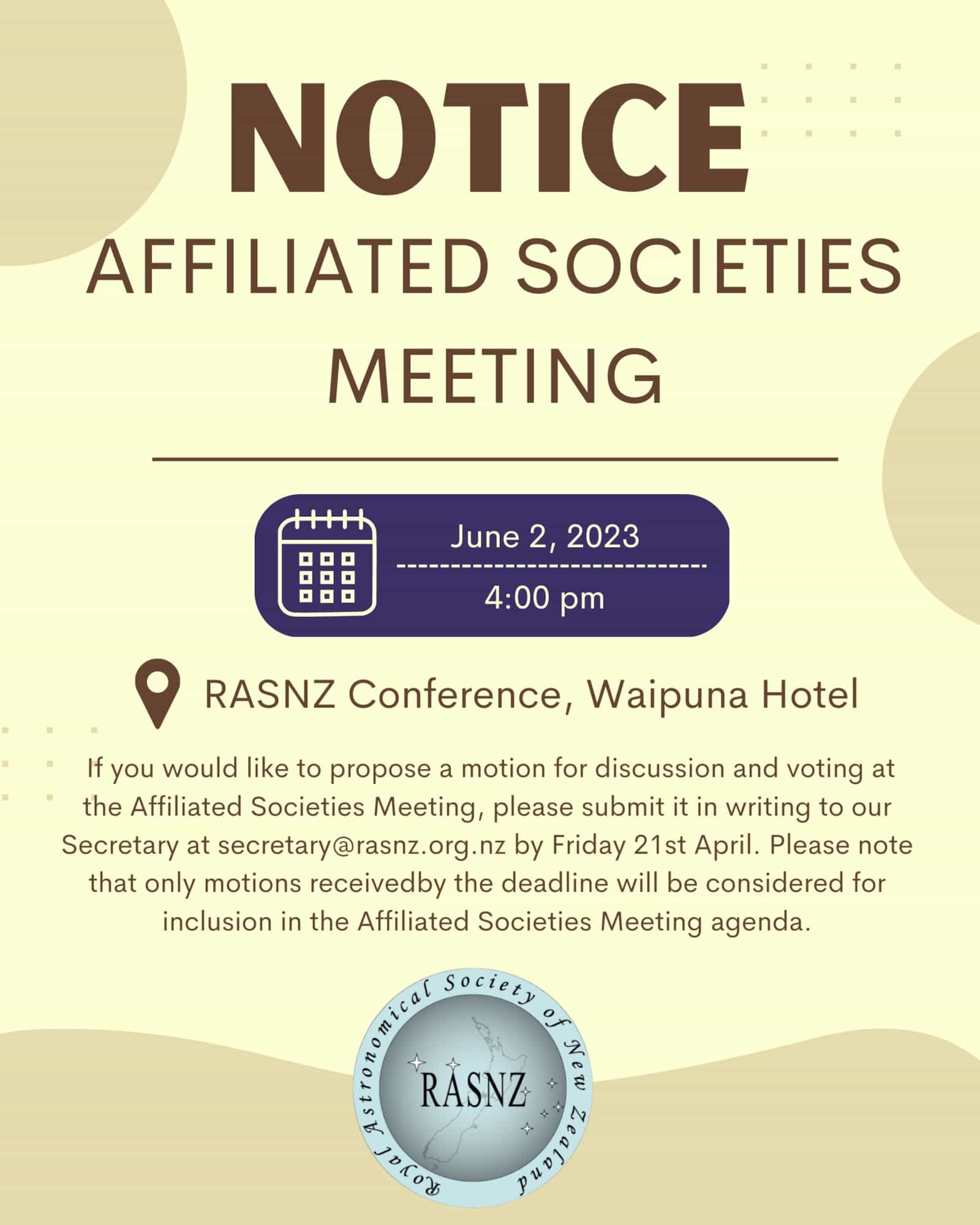 The deadline for motions for this meeting is Friday 21st April. If you are a member of an Affiliated Society and wish to have a matter raised at this meeting please talk with your society leadership.