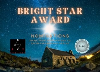 The Bright Star Award shall be awarded to a person or persons at intervals of not more than five years nor less than one year for contributions in New Zealand in promoting astronomy to the public, or in astronomical education, or in promoting dark skies to allow astrotourism to flourish.